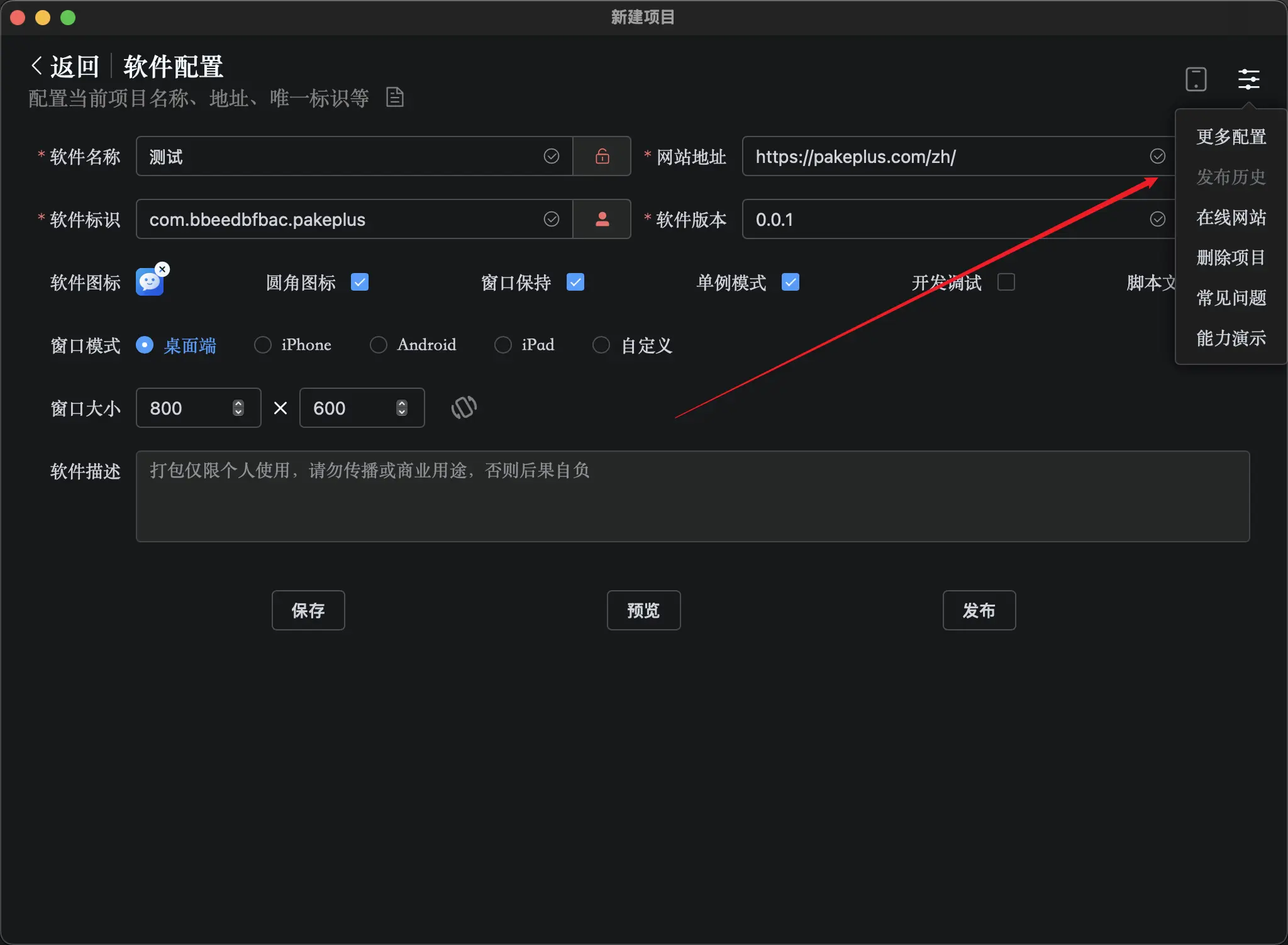 简单配置后,就可以点击预览按钮来预览你的软件最终显示的时候长什么样子了。 确认无误后,点击发布,就可以开始打包了。